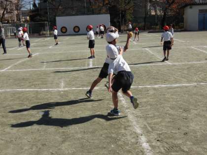 ボールを思い切り投げるには、ボールを持たない手でタイミングをはかったり、足を前に踏み込んだり、全身を使うことが必要です。友達と何度も練習しながらそのコツをつかんでいきます。
