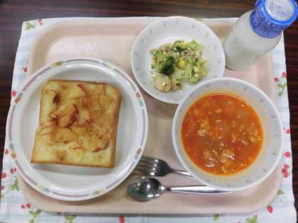 献立は、アップルトースト、えびとブロッコリーのサラダ、ミネストローネ、牛乳です。