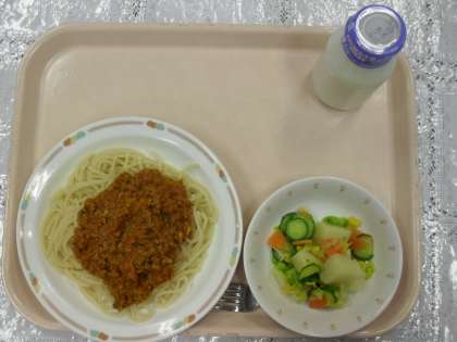 今日のメニューは、スパゲティーミートソース、ポテト入りフレンチサラダ、牛乳です。ミートソースは、子どもたちも大好きなメニュー、残さず食べていました。