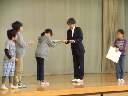 朝会で、交通安全ポスターに応募し、入選した8人のお友達を代表して2人のお友達に賞状を渡しました。おめでとう。8人のお友達は、自分のポスターがプリントされたTシャツもいただきました。