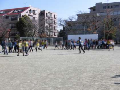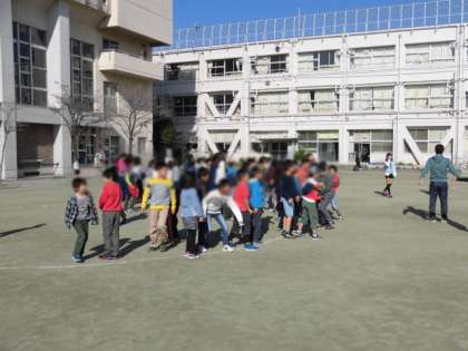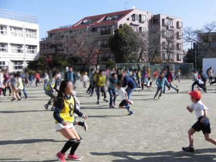 校庭に6つの島があり、笛の合図で次の島に鬼に捕まらずに移動します。