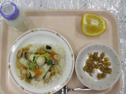 今日のメニューは、中華丼、大豆とじゃこの甘辛揚げ、夏ミカン、牛乳でした。