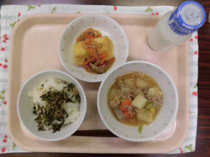 献立は、ごはん、大根葉のじゃこ炒め、揚げ出し豆腐きのこあん、豚肉と大根のうま煮、牛乳です。