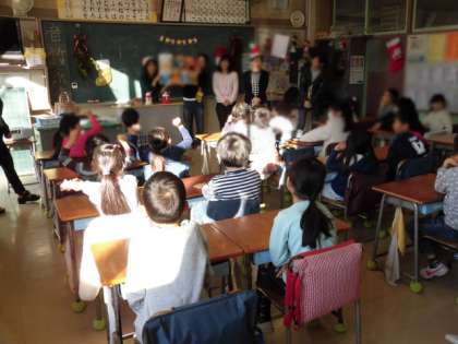 1年生の英語タイムでは、英語の絵本を読んでいただいたり、ビンゴゲームをしたりして楽しんでいました。ボランティアの皆さんが、子どもたちのために、いろいろな準備をしてくださっています。子どもたちの声からも楽しんでいることが感じられます。