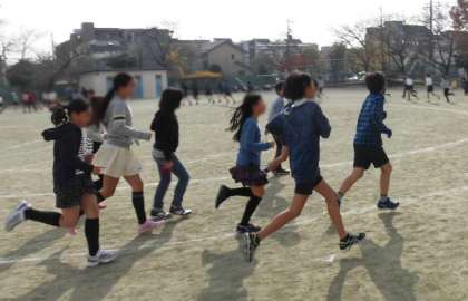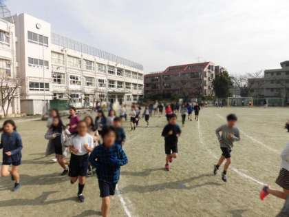 中休みには、さっそく高学年(今日は5・6年生)のお友達が走りました。コースは2つ、内側が「ゆっくりコース」、外側が「がんばりコース」です。自分の力に合わせて同じペースで走ることを1つの目標として取り組んでいきます。