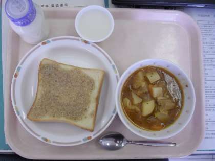 今日の給食は、セサミトースト、ボルシチ、ホワイトゼリー、牛乳でした。