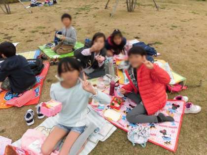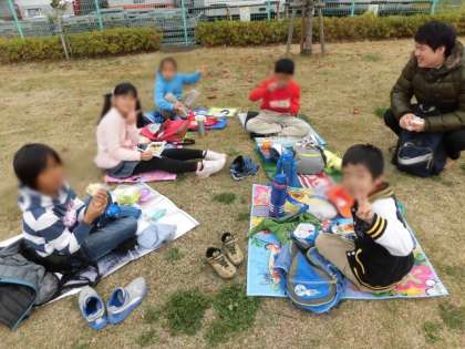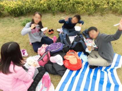 水の科学館前の芝生広場で楽しいお弁当タイムです。