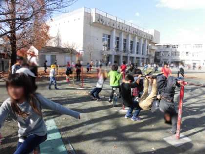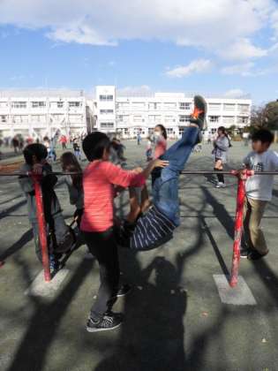 体育で鉄棒に取り組んでいた6年生が、新しい技にも挑戦していました。体育の時間だけでなく、休み時間にも挑戦することで技を身に付ける近道です。