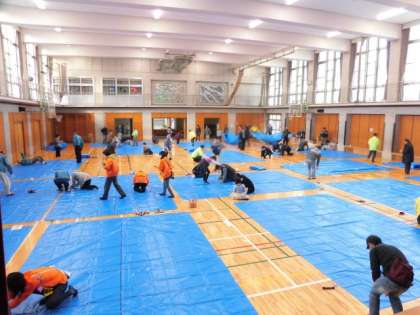 今年で3回目を迎えた避難所運営訓練を13:30から実施しました。各町会の担当者、等々力出張所、その他関係者約70人が集まってくださいました。今回の訓練の主な目的は、「避難者一人ひとりの場所を明らかにするためにブルーシートに線を引くこと」「体育館にどのようにブルーシートを敷くか」「何人収容することができるか」ということです。