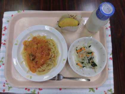 献立は、スパゲティトマトクリーム、大根サラダ、スイートポテト、牛乳です。
