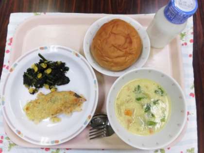 献立は、黒糖パン、シイラのガーリック焼き、ほうれん草とコーンのソテー、チーズと卵のスープ、牛乳です。
