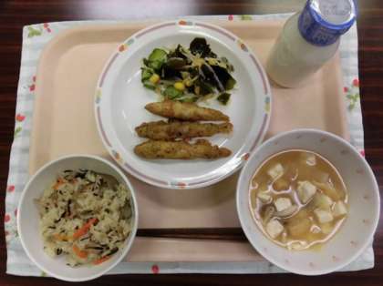 献立は、五目ごはん、わかさぎの磯辺揚げ、酢の物、みそ汁、牛乳です。
