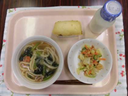 献立は、みぞれうどん、れんこんチップサラダ(ゆずドレッシング)、冬至かぼちゃまん、牛乳です。