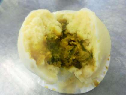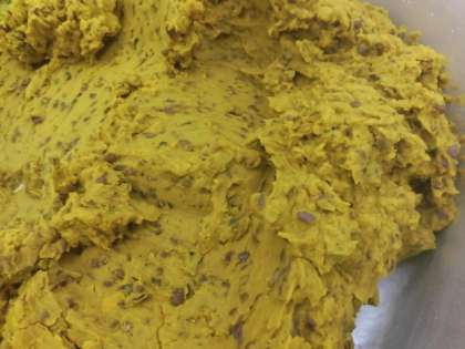 冬至かぼちゃ(かぼちゃと小豆のいとこ煮)をアレンジして、蒸しパン生地をくるみました。小豆を豆から給食室で煮詰め、バターを少し加えた特製かぼちゃあんが人気でした。