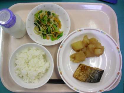 今日の給食は、ごはん さばの照り焼き じゃがいもの甘辛煮 おひたし です。さばは脂がのっていておいしかったです。1・2年生は遠足予定だったのでお弁当でしたが、どのクラスも残菜がとても少なかったです。