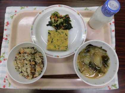 献立は、ひじきごはん、しらすと小松菜の卵焼き、おろしポン酢あえ、みそ汁、牛乳です。