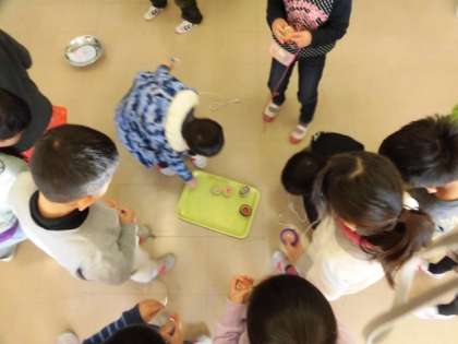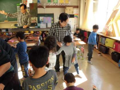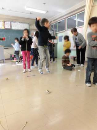 昔遊びに取り組む1年生に、伊藤名人がいらしてくださいました。そしてコマ回しの技を紹介してくださったり、回し方のコツを教えてくださったりしました。
