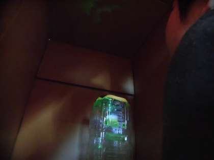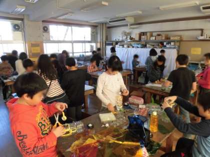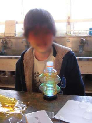 3色に光るライトを使って、ランプづくりに取り組みました。材料は、ペットボトルや卵のケース、セロハンなど透明な様々な素材を使っていました。