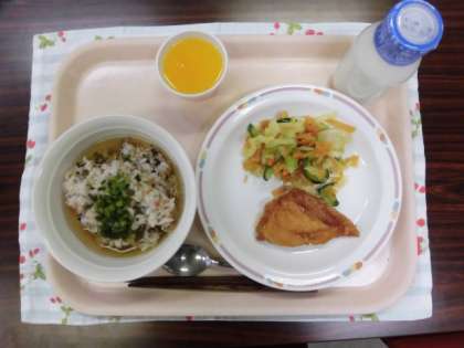 献立は、梅茶漬け、鶏のから揚げ甘酢だれ、パリパリサラダ、オレンジゼリー、牛乳です。