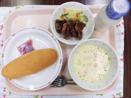 献立は、コッペパン、いちごジャム、くじらの竜田揚げ、フレンチサラダ、クリームスープ、牛乳です。