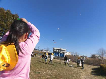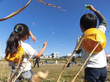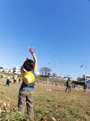 寒空の下、子どもたちは額に汗を浮かべながらおもいきり走って、凧を揚げていました。凧が揚がると、夢中になってさらに高く高く揚げようと工夫していて、とっても楽しそうでした。