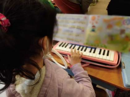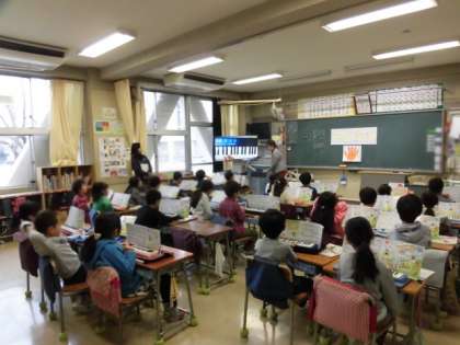 次に、鍵盤ハーモニカで「はなのレイ」を練習しました。指使いにも気を付けました。先生が一人ひとり見てくださっています。