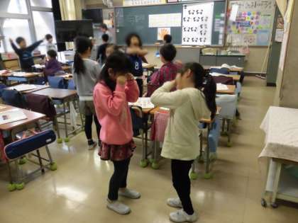 して、「おちゃらかほい」を楽しみました。最初は、決まったポーズで、その後は、組んだお友達とポーズを決めてやりました。二組のお友達のポーズもみんなで見ました。勝っても負けても楽しんでいました。