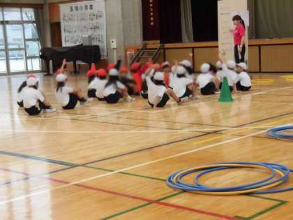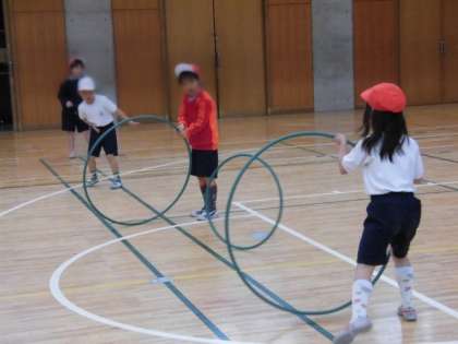 体育の「体つくり運動」として、フラフープを使った運動を中心に楽しみました。