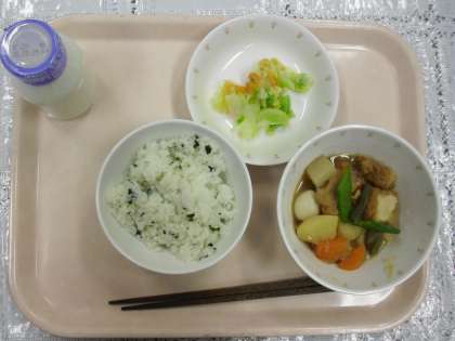 今日のメニューは、わかめご飯、春野菜のうま煮、ひとしお野菜、牛乳でした。