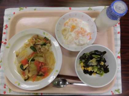 献立は、あんかけチャーハン、わかめサラダ、フルーツヨーグルト、牛乳です。