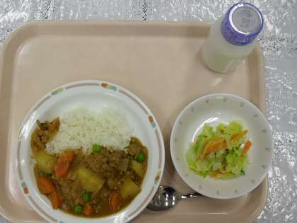 今日のメニューは、カレーライス、ふくじん漬け、キャベツサラダ、牛乳です。4月最後の給食になります。連休明けから、5月の給食になります。天候もよくなると思います。好き嫌いなく食べて、元気よく生活して欲しいです。