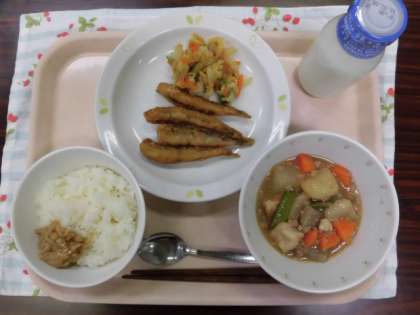 献立は、ごはん、なめたけ、ニギスのから揚げ、おひたし、大根と生揚げのそぼろ煮、牛乳です。