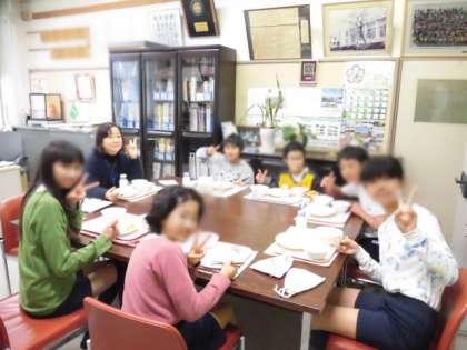 だんだんと卒業が迫ってきた6年生と校長先生が一緒に給食をいただく「会食」を今日から始めました。1日、5・6人のグループで15回予定しています。