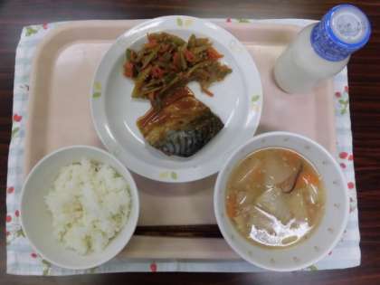 献立は、ごはん、さばのみそ煮、五目きんぴら、大根のあんかけ汁、牛乳です。