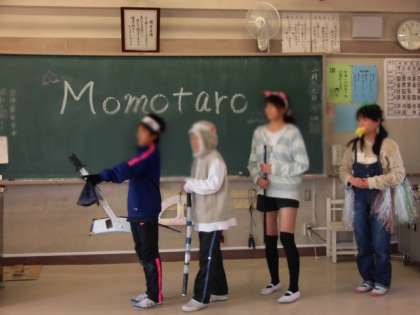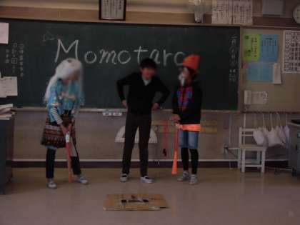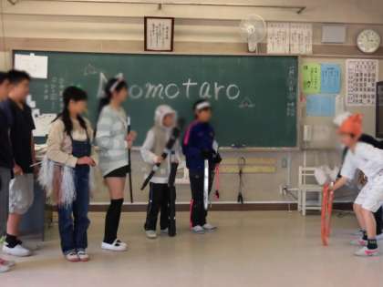 6年生の授業も大詰めにきています。外国語活動では、英語活動の集大成として英語劇に挑戦です。タイトルは「桃太郎」。三つのグループに分かれ、それぞれの個性あふれる桃太郎劇をすべて英語で行います。