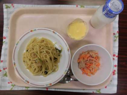 献立は、小松菜とベーコンのスパゲティ、にんじんとツナのサラダ、手作りプリン、牛乳です。