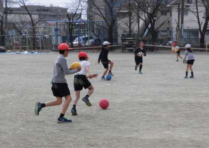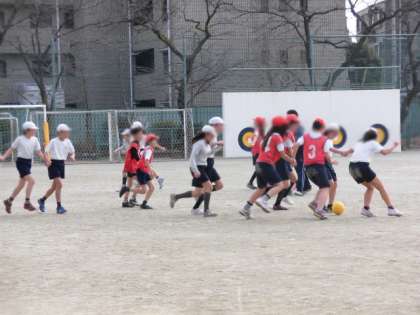 最後には、2・3人で手をつないでゲームをしました。子どもたちにとっては経験のない方法だったと思いますが、みんな笑顔でボールを追っていました。