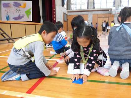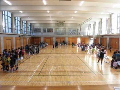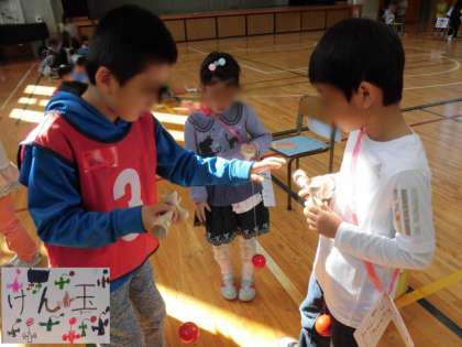 2年生の司会で会が始まりました。遊びの種類は7つ。1年生がグループに分かれ、遊びのブースに行きました。