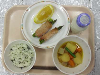 今日のメニューは、わかめご飯、アスパラの豚肉巻き、新じゃがのそぼろ煮、夏ミカン、牛乳でした。アスパラの豚肉巻きは、ボリュームがあり、美味しく、わかめご飯に合いました。