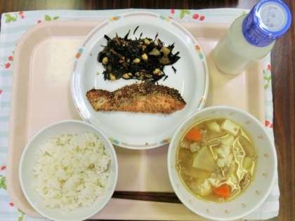 献立は、麦ごはん、さけの南部焼き、ひじきの五目煮、豚汁、牛乳です。