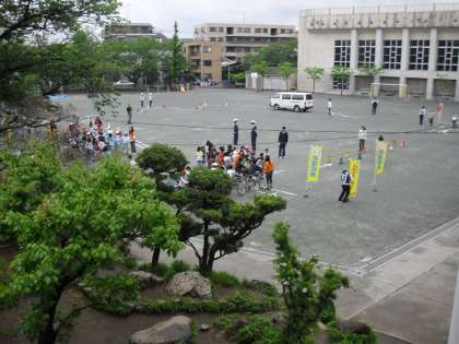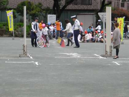 先月の28日に予定していた「交通安全教室」を天候が危ぶまれる本日、玉川警察署の方とPTAの校外委員会の方のご協力を得て、実施しました。3年生は、自転車の乗り方も校庭で実地練習がありました。登校する時に自分の自転車を押して、用意しました。自転車に乗り、交差点の乗り方、止まっている車の横切り方、スラロームの通り方など、実際に行いました。普段と違い、少し緊張していました。今日の学習で安全に乗れるようになるといいと思います。