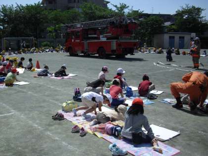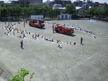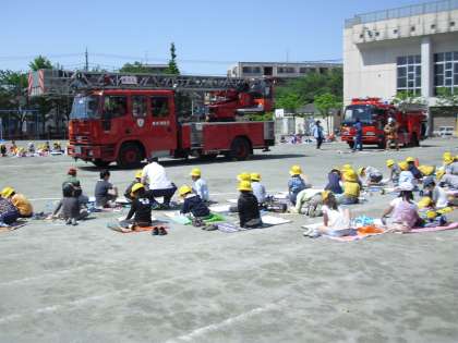 晴天に恵まれた今日、1・2校時に玉川消防署のご協力を得て、1・2年生が消防車の写生会を行いました。校庭にはしご車、ポンプ車の2台が入り、1・2年生の子どもたちが取り囲んで、絵を描きました。女性の消防官の方が消防服を着て、ポーズをしてくださり子どもたちは、画用紙に大きく自分の気にいったところを一生懸命に描きました。作品の出来上がりがとても楽しみです。