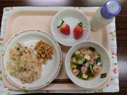 献立は、さけちらしずし、大豆とアーモンドの甘辛揚げ、菜の花のすまし汁、いちご、牛乳です。