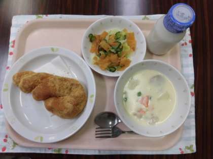 献立は、きなこ揚げパン、パリパリサラダ、米粉のシチュー、牛乳です。