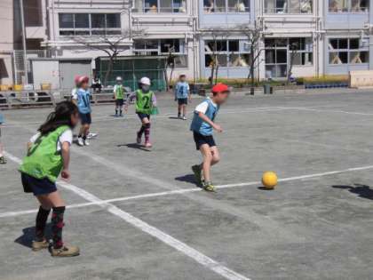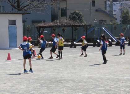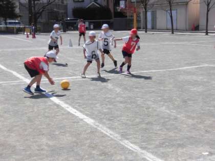 冷たい風が強くてボールが飛ばされてしまうほどでしたが、日差しは温かでした。工程では、元気いっぱいの3年生がラインサッカーをしていました。お互いに声をかけながらボールを運び、さあシュート!!