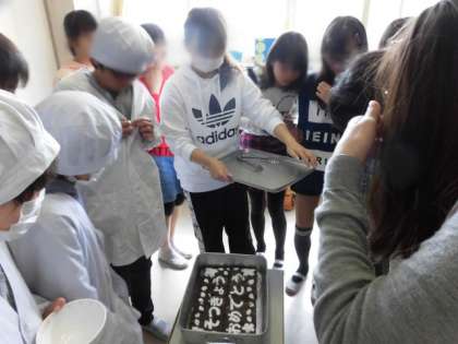 給食の卒業おめでとうのメッセージケーキは、開けた瞬間「わあっ」と喜んでいました。