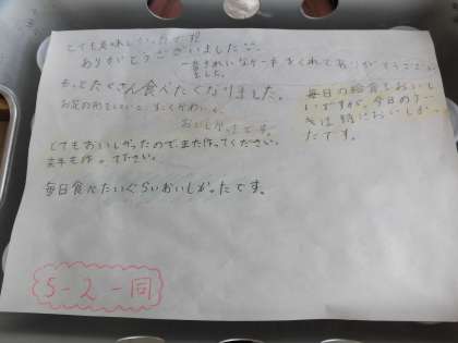 5年生から給食室にお手紙をもらいました。今までもこんな風に、ワゴンを返すときに時々給食室へお手紙を書いてくれる子ども達がたくさんいました。