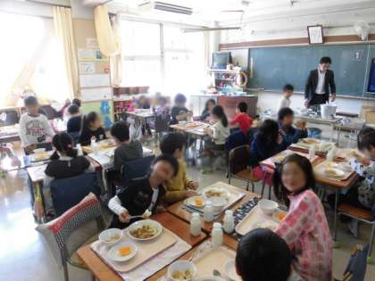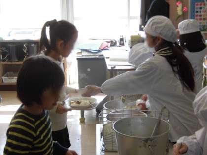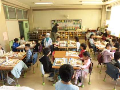 1年生の様子です。入学してから1年間が経ちます。給食当番も自分たちでしっかりできます。食べる量も増えました。