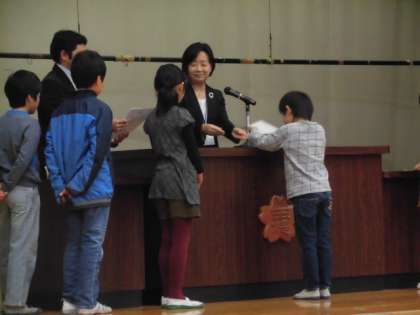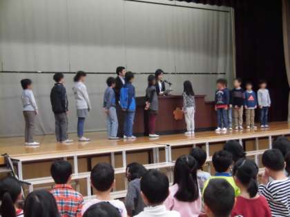 ついに最後の日になりました。朝は雨がパラパラ降っていたので、体育館で修了式を行いました。まずは、各クラスの代表のお友達に修了証の授与をしました。1年間、学習や生活に対する自分の目標に向かって、みんなとても頑張りました。