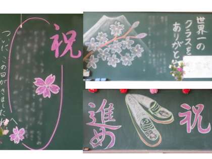 担任の先生方が各教室の黒板にかいた温かく、そして思いのこもったメッセージが、卒業生を迎えます。